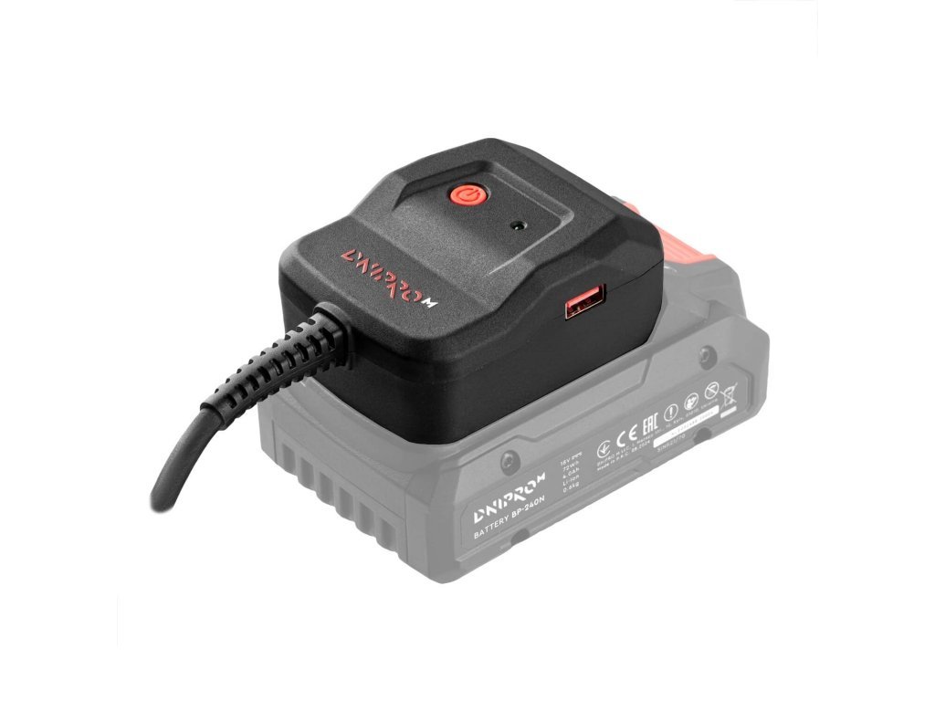 Adaptér je také vybaven USB portem, takže se baterie snadno promění v přenosnou nabíječku (PowerBank) pro nabíjení telefonu nebo baterky v terénu.