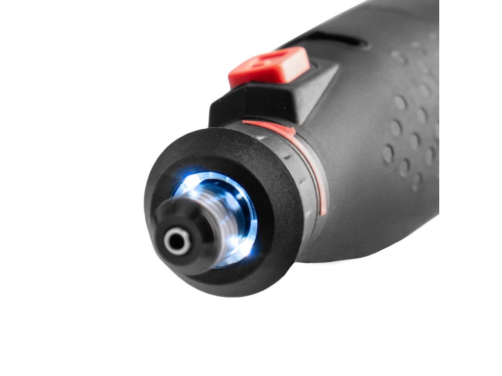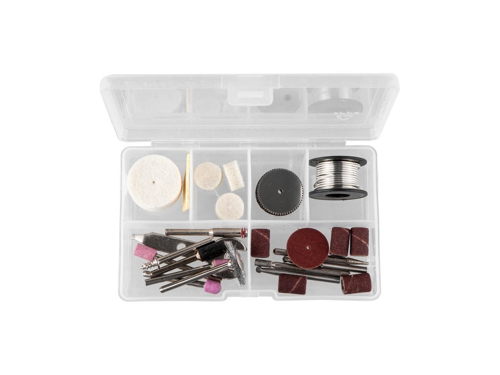 Sada obsahuje více než 15 nástavců (brusné kameny, řezné kotouče, vrtačky atd.) pro provádění nejrůznějších úkolů: od řezání kovu a odstraňování rzi až po leštění a gravírování vzorů na dřevě nebo skle.