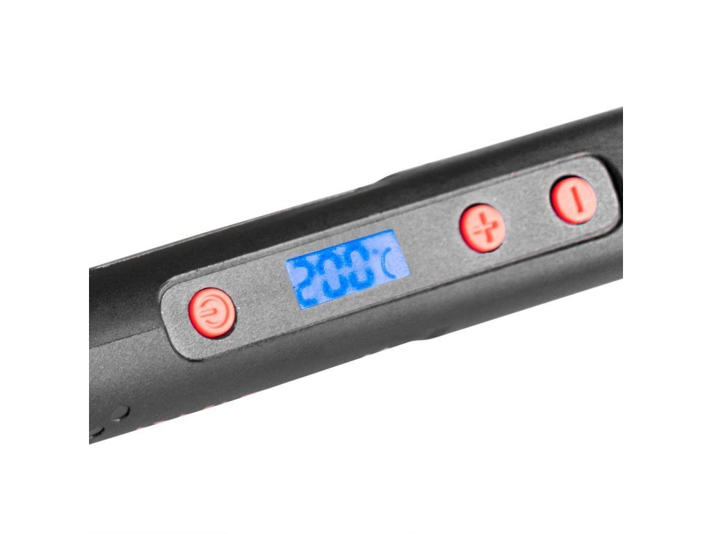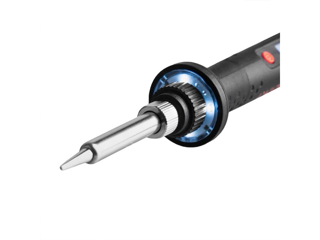 Akumulátorová páječka DCT-200-S je vybavena digitální regulací teploty v rozsahu 200–450 °C. To usnadňuje výběr optimálního ohřevu pro různé úkoly - od pájení tenké elektroniky až po silné dráty. Digitální displej a tlačítka umožňují přesné ovládání teploty.