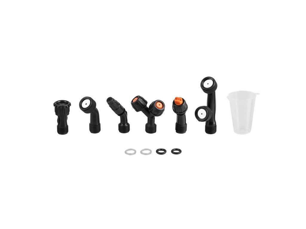Sada obsahuje 6 vyměnitelných trysek pro různé typy ošetření: od bodového postřiku až po široké pokrytí.