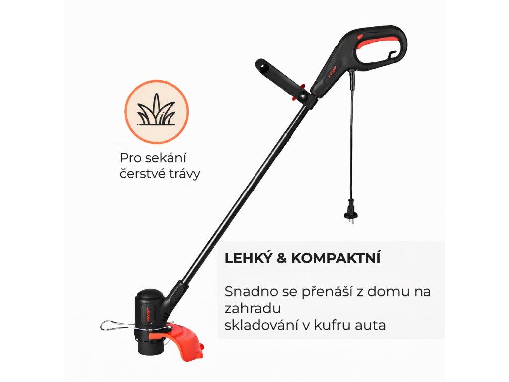 Jednostranná cívka zajišťuje přesný a čistý řez, umožňuje upravovat okraje trávníku, záhony a další citlivé oblasti s maximální přesností. Trávu lze snadno zastřihnout kolem záhonů, stromů a dalších prvků zahrady, aniž by došlo k jejich poškození.