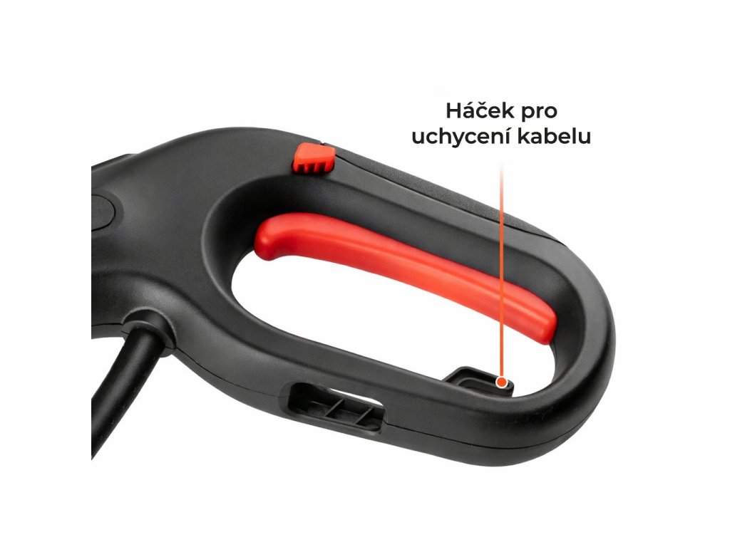 Má háček pro upevnění kabelu, který zabraňuje jeho náhodnému vytažení a odpojení od elektrické sítě při zachycení o keře, stromy nebo jiné překážky.