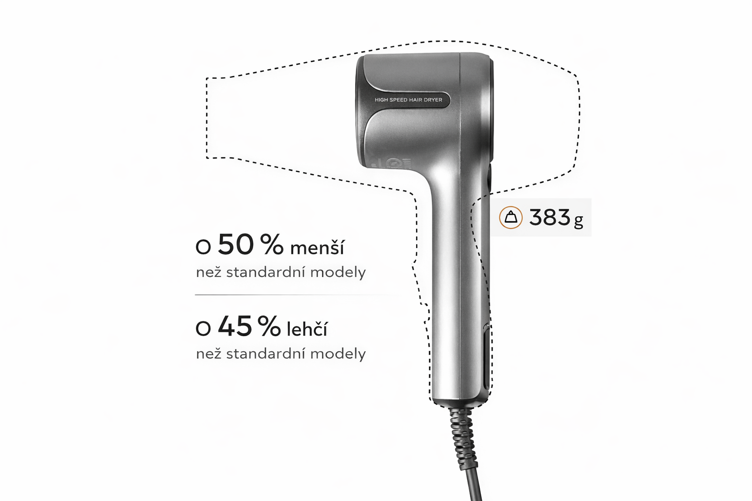 Fén pro domácí použití je o 50 % kompaktnější a o 45 % lehčí než standardní modely – jeho hmotnost činí pouze 383 g. Přesunutí motoru do rukojeti zlepšuje vyvážení a rovnoměrně rozděluje zatížení, což snižuje únavu ruky a zvyšuje kontrolu při dlouhodobém sušení a úpravě vlasů.