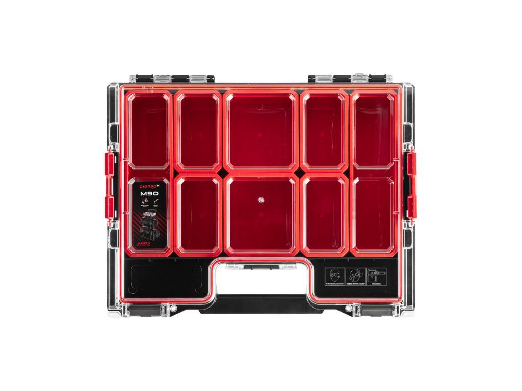 Organizér S-Box M90 z řady „M“ se snadno kombinuje s dalšími moduly a je určen pro ukládání a přepravu ručního nářadí a spotřebního materiálu.