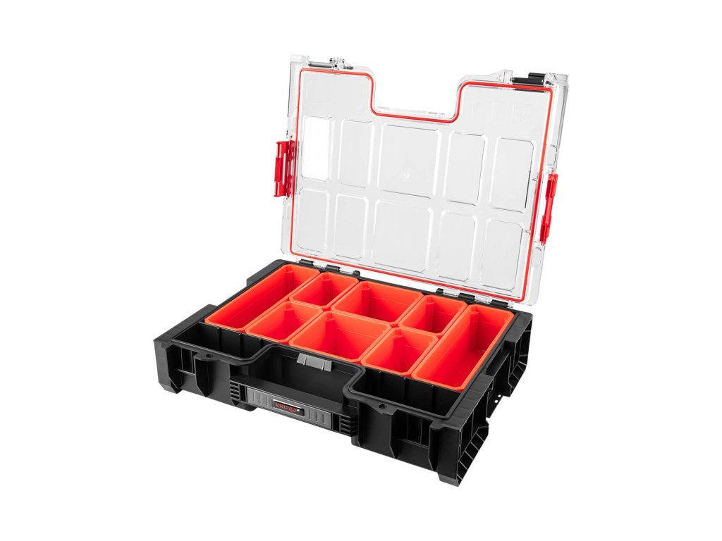 5 zamykacích spon víka zajišťuje pevné uzavření a zabraňuje náhodnému otevření organizéru během přepravy nebo přemisťování.